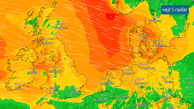 Især fra Nordtyskland, Danmark og Holland til Storbritannien blæser der i dag en stærk til stormfuld og kold vind.