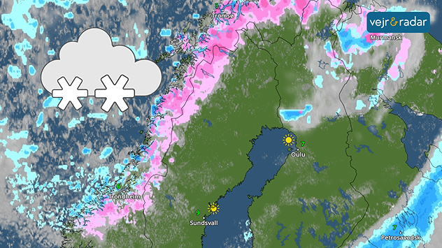 Vejrkort fra Vejr & Radar, der viser sne og slud langs Norges kyst fra Trondheim til Tromsø samt over det nordlige Sverige og Finland. Sne-ikoner markerer udbredt snefald, mens der er lidt sol ved Sundsvall.Sneen i de Skandinaviske fjelde kan ses i VejrRadaren - © Vejr & Radar