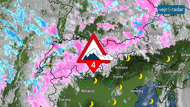 Vejrradaren viser kraftige snefald i Alperne. Der er derfor stor fare for laviner.