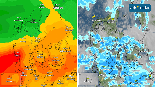Vejrkort med regn og byger over Danmark mandag den 29. september.© Vejr & Radar
